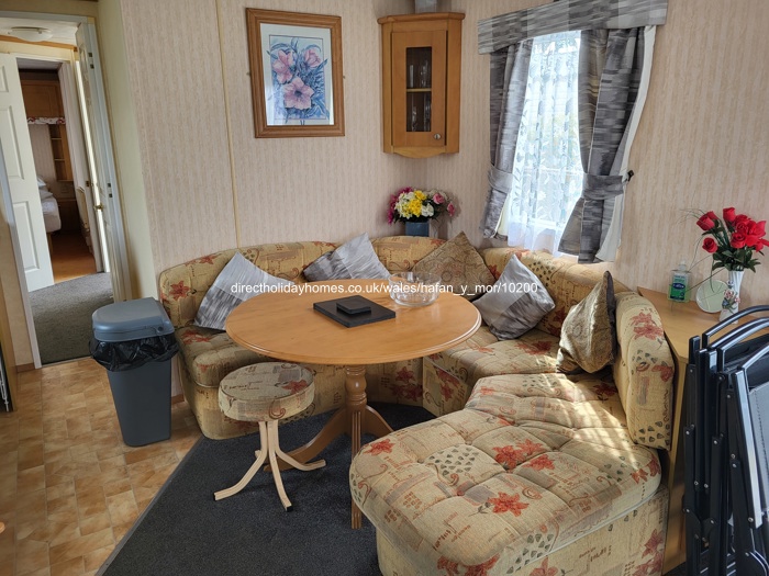 Standard 3 bedroom caravan to let at Hafan Y Mor Holiday Park in Pwllheli, North Wales, offering a lovely, enclosed wooden veranda; ideal for children, with plenty of space to play safely.