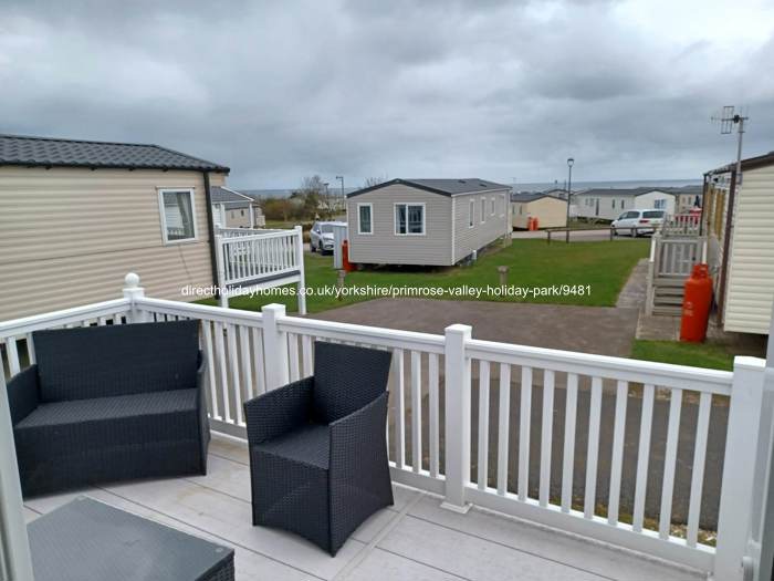 Family-owned caravan with decking for hire on Primrose Valley Holiday Park in Filey, boasting a front row position on Pine Ridge, with lovely sea views and overlooking a green area.