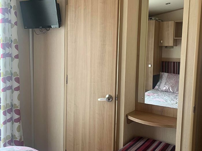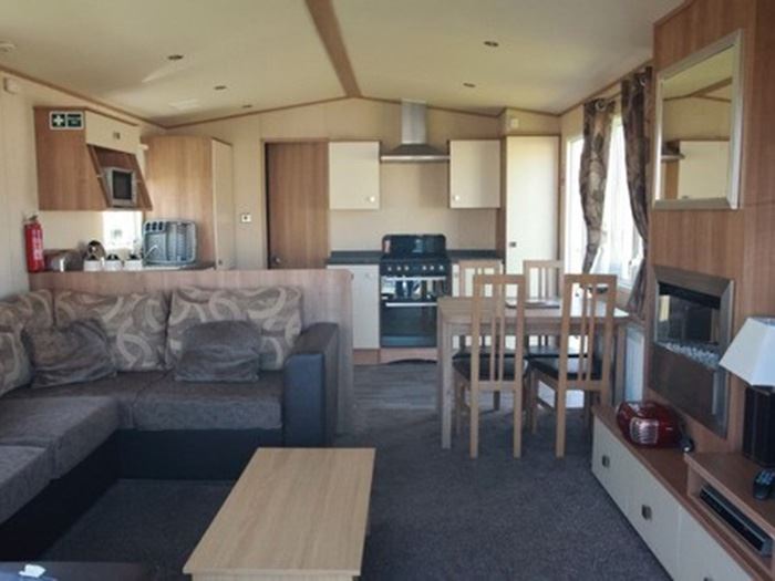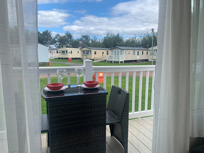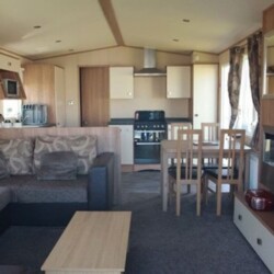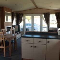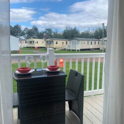 Spacious 3 bedroom, 8 berth ABI Sunningdale caravan to let on Seton Sands Holiday Village in East Lothian, complete with French doors that open out onto a veranda, plus parking available alongside.
