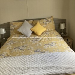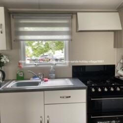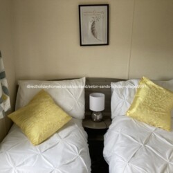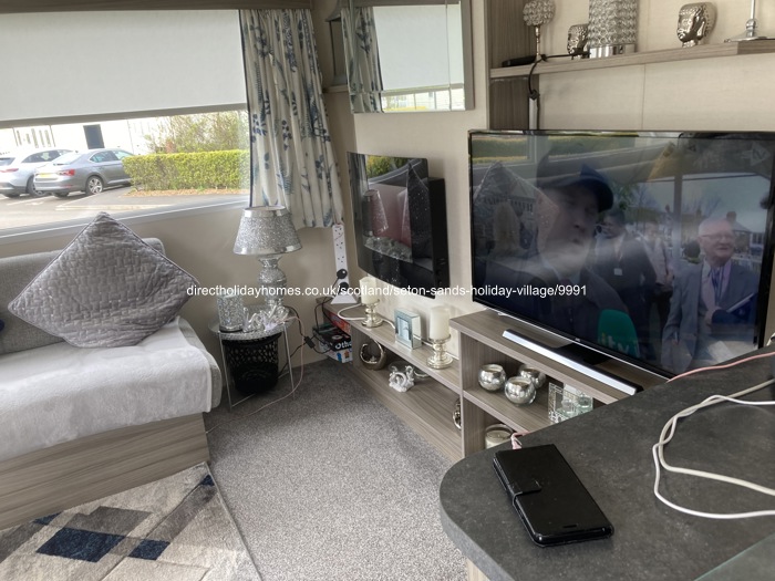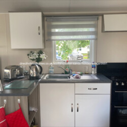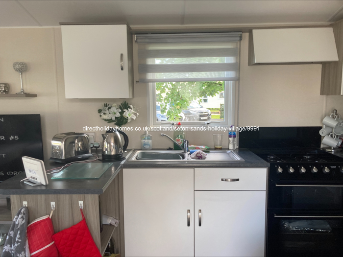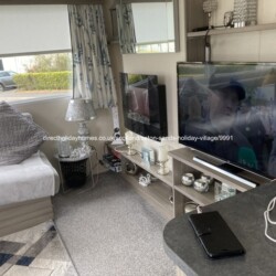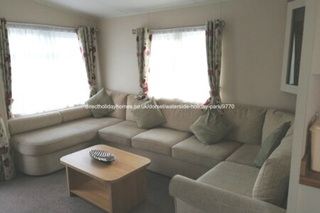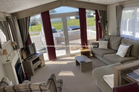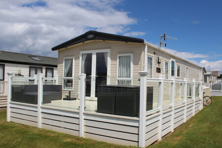 Family holiday caravan on Haven’s Seton Sands Holiday Park, benefitting from a decking area with rattan furniture and patio table and chairs; a real sun trap in good weather.