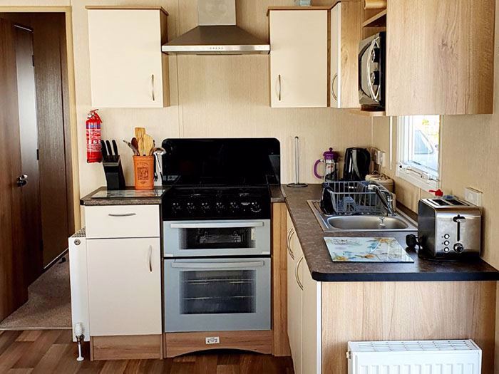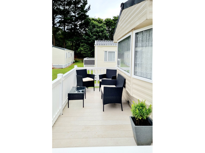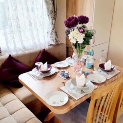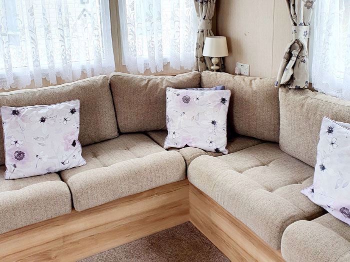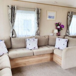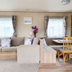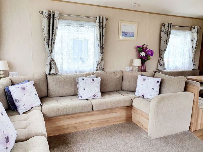 This beautiful dog friendly caravan for hire on Shorefield Country Park has a very spacious open plan feel in the living area with a large comfy sofa & plenty of space for dining both inside & out.