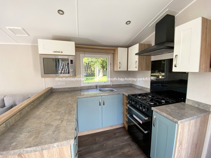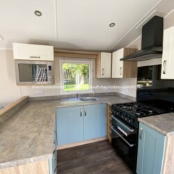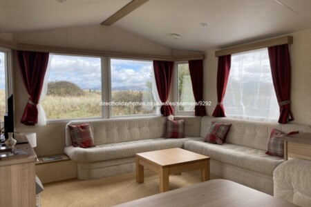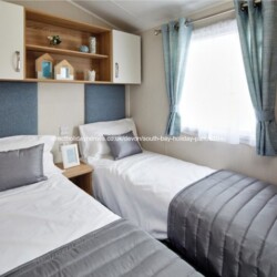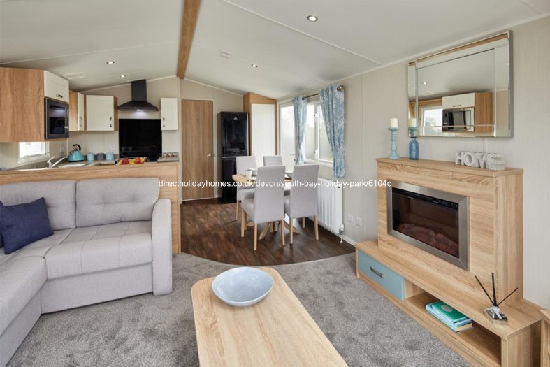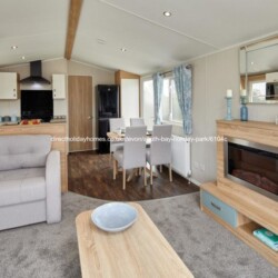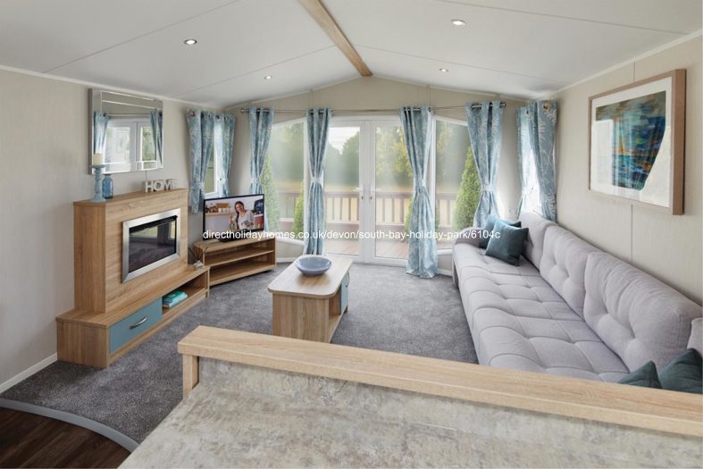 This two bedroom static caravan boasts sea & bay views from the full length windows, it is for hire at South Bay Holiday Park in Devon.