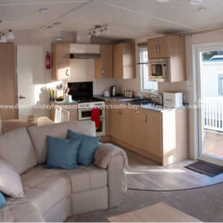 Our central heated and double glazed caravan for hire on South Bay Holiday Park, has the benefit of a veranda with patio set to enjoy the sunshine.