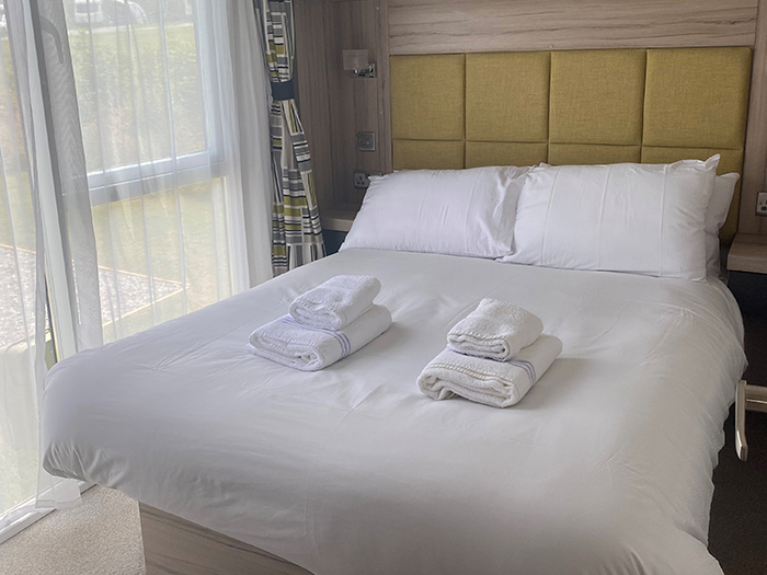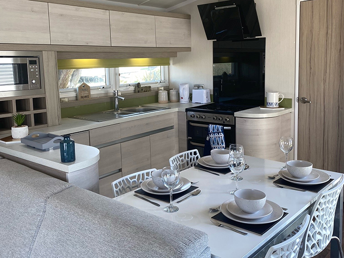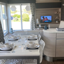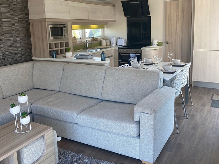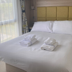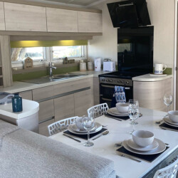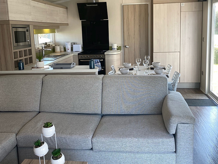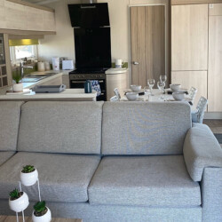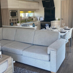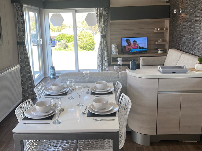 This is our beautiful, three bedroom, pet friendly Swift Alsace that benefits from a wraparound decking in an elevated position, so you can enjoy far reaching views of the countryside & fishing lake at Trevella Holiday Park in Newquay, Cornwall.