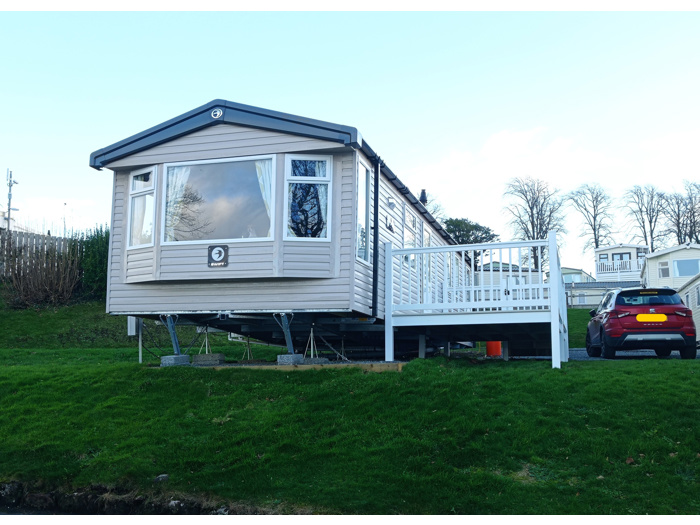 Central heated and double glazed, 3 bedroom, 2021 holiday caravan with decking area for hire on Wemyss Bay Holiday Park, offering stunning views of the Firth of Clyde.
